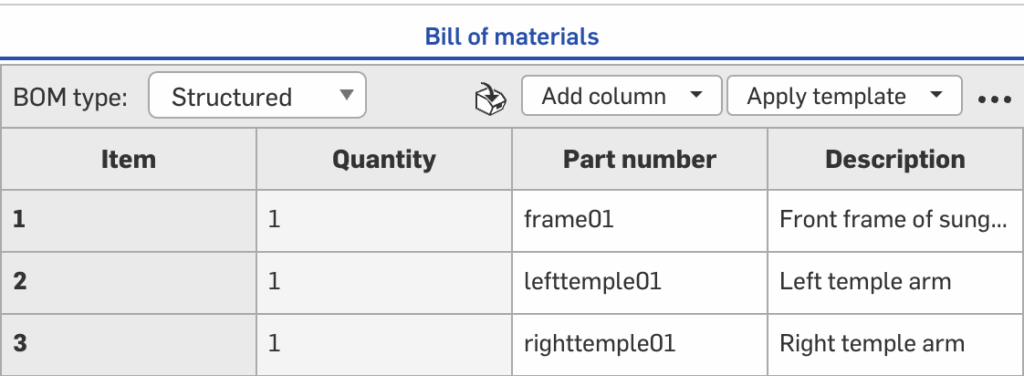 This is my Bill of Materials(BOM) which has all the information about each part of my sunglasses assembly.