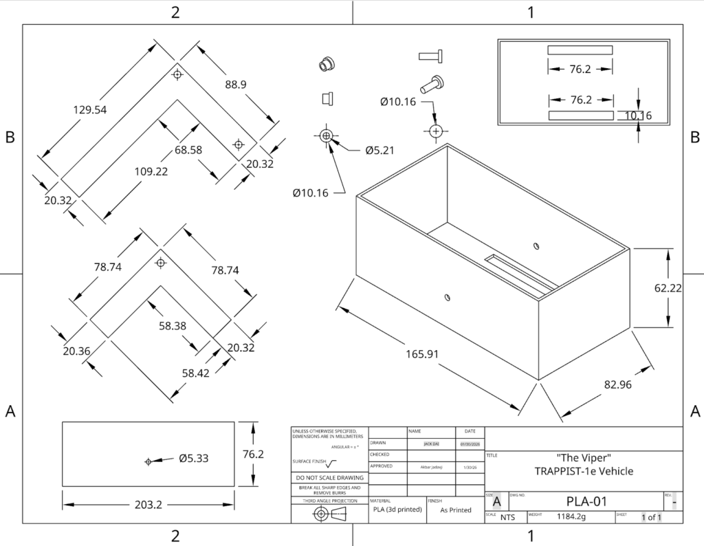 To summarize the design prompt, we need to build a vehicle to survive TRAPPIST-1e’s dangerous conditions and carry 4 passengers over a distance of 10km. Our design has the potential to do all of this. It will, of course, need some larger tweaks as we scale the vehicle, but the general design our group made would perform on our planet.