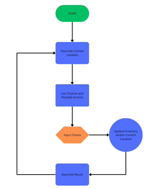 The code is split into two main parts, which work together to create the game. For a simple explanation of how the code operates, view this flowchart: The first section is made up of a lot of text, which is used to describe the locations to the computer, including things like what it should say when the player arrives there, the directions the player is able to travel from where they are and where they lead, and any items the player can pick up in that location. This information is used in the next section, which is the main loop.