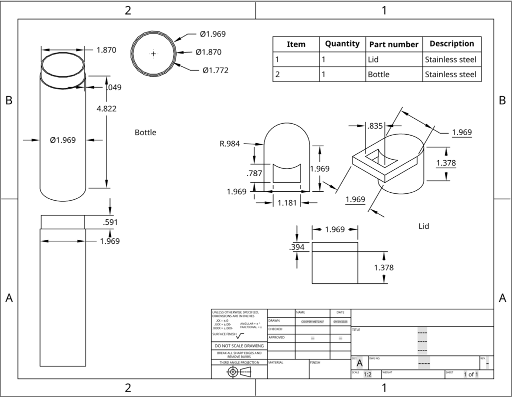 In this drawing, I added a BOM, or Bill Of Materials. For this, I decided to make both parts out of stainless steel, due to its durability and lack of microplastics.
