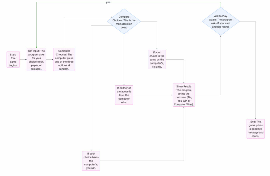 I am new to coding, so for my first project, I chose to create a simple Rock, Paper, Scissors game. This game was a good way for me to practice the basics of Python, such as functions, loops, and conditional statements. I also wanted to make sure the program was user-friendly, so I added clear messages, error checking, and a replay option to make it easy to use.