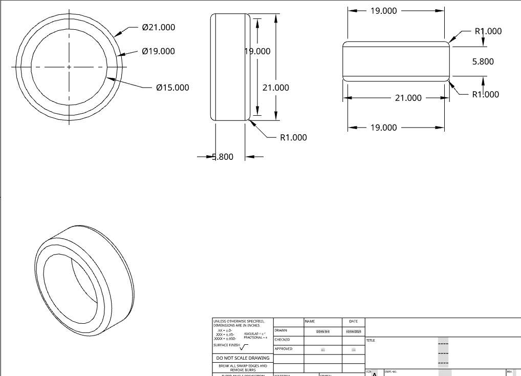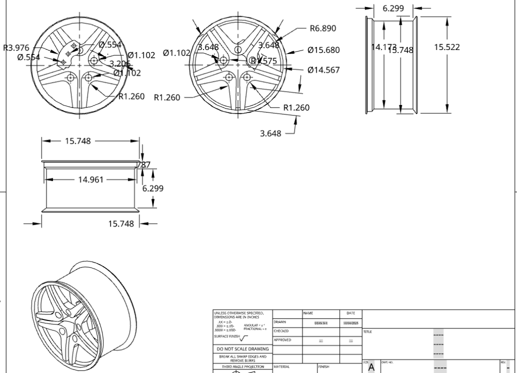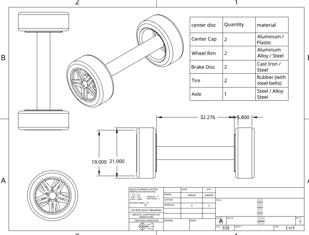 The wheel project turned out really well. Each part, the center disc, wheel rim with brake, tire, and axle, they fit together neatly, and duplicating the wheel to create two on the same axle works smoothly. The wheels rotate properly, and the assembly demonstrates how all the components interact in a functional system. While some details, like the size of the center disc or spacing of the rim cutouts, could be improved, the overall design is realistic, balanced, and visually appealing. This project allowed me to practice all core CAD skills such as sketching, extruding, assembling, creating mechanical drawings, and generating a BOM.