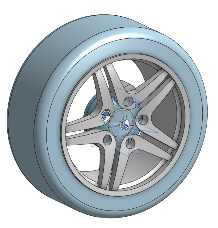 The assembly combines all the components: center disc, wheel rim with brake, tire, and axle. After completing the first wheel, I duplicated it so that there are two wheels on the same axle