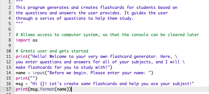 Without the list called “flashcards” and the .append string method from earlier, the computer would not remember each question and answer to be different. It would simply print that latest question and answer that the user entered, overriding each of the previous pieces of information. This is the most integral aspect of the program.