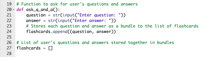 It does this by using the .append string method, with the brackets containing the question followed by the answer. Through this method, the question and answer is stored in the list, so that if the user enters multiple questions and answers later on, they will all be printed in order. Finally, line twenty-seven defines the list known as flashcards through square brackets.