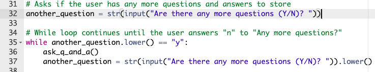 The above section of code comes after the function “ask_q_and_a” is called. Line thirty-two is straight forward, asking whether or not the user has any more questions to enter. The “while” loop on line thirty-five states that the program will repeat the process (asking the user for information, and then asking whether or not there is more), until the user finally enters that there are no more questions.