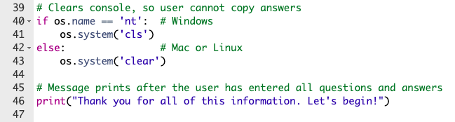 The above section of code ties back to the “import os” call at the very beginning of the program. It uses its access to the computer system to clear the console so the user cannot see the answers to the questions. Without this portion of the program, the user would be able to simply look at and copy the answer that they had entered earlier into the console.