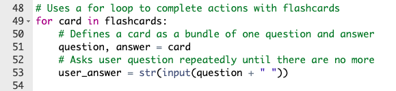The portion of code above is the integral for loop that allows the questions that the user previously entered, to be asked back to the console. Line forty-nine is a loop that continues until every card in the set of flashcards has been asked to the user. Line fifty-one explains that one card includes both the question and the answer (a bundle). Line fifty-three asks the question, and the process continues until there are no more questions.