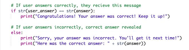 The above portion of code includes an if else statement that accounts both for if the user answered correctly or incorrectly. If their answer is correct, the message on line fifty-seven is printed to the console, and if it is incorrect, the correct answer and the message on line sixty-one is printed. The rest of the program is simply a message that sends off the user, and concludes the code.