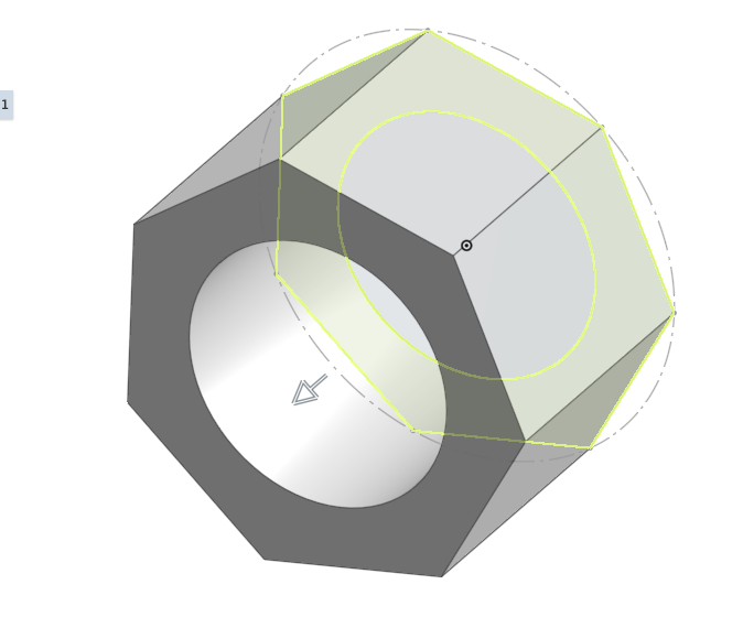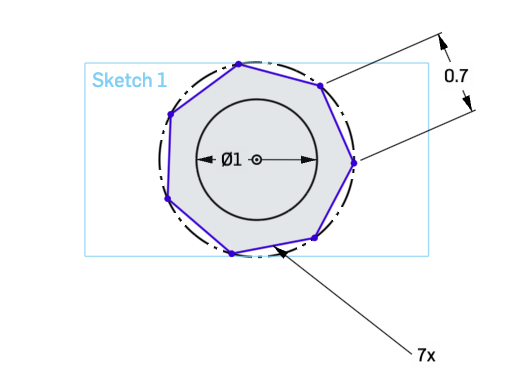 The first step in the creation of the outside stoppers was again sketching. For this phase, I used a heptagon to best represent the strapped stoppers that are usually used in gyms. Each side is 0.7 inches, and the inner circle had to have a diameter of 1 inch to allow the barbell to fit through. Again, the sketching was simple, getting ready for the extrusion phase.