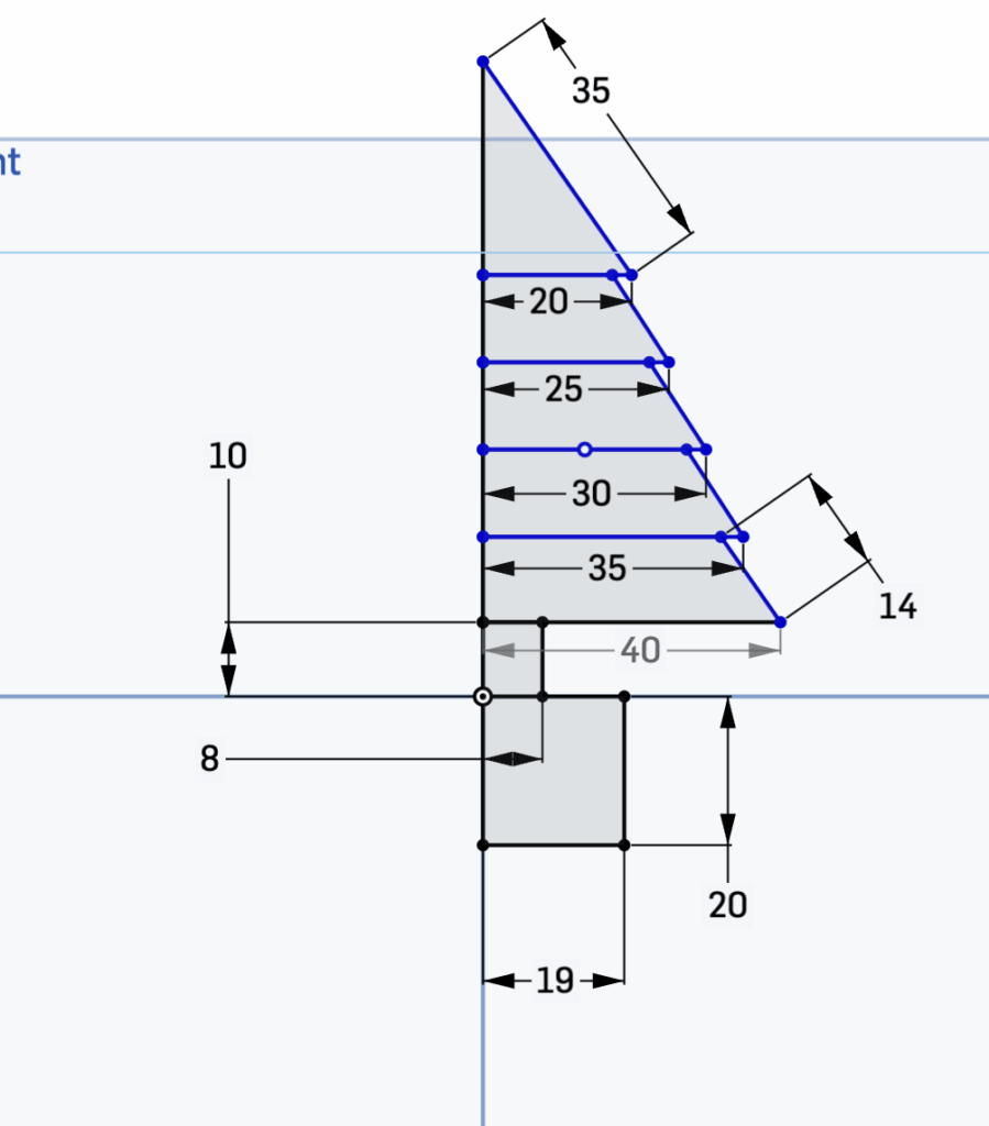 The overall process of creating this project can be divided into 3 main sections. The most important part of this design is the initial sketches. This sketch not only presents the shape of the plants and pot, but also maps out their dimensions to ensure each part connects with one another. The showcased example is a front-view sketch of the Christmas tree. On the bottom of the sketch, I decided to create an attachment block of standard dimensions (19 mm x 20 mm) that would fit into my pot hole. Each of the Christmas tree’s layers decrease by width incrementally, while maintaining a constant height. This helps to create symmetry in my design and ensures that the dimensions of the project would be easy to replicate by others viewing the mechanical drawing.
