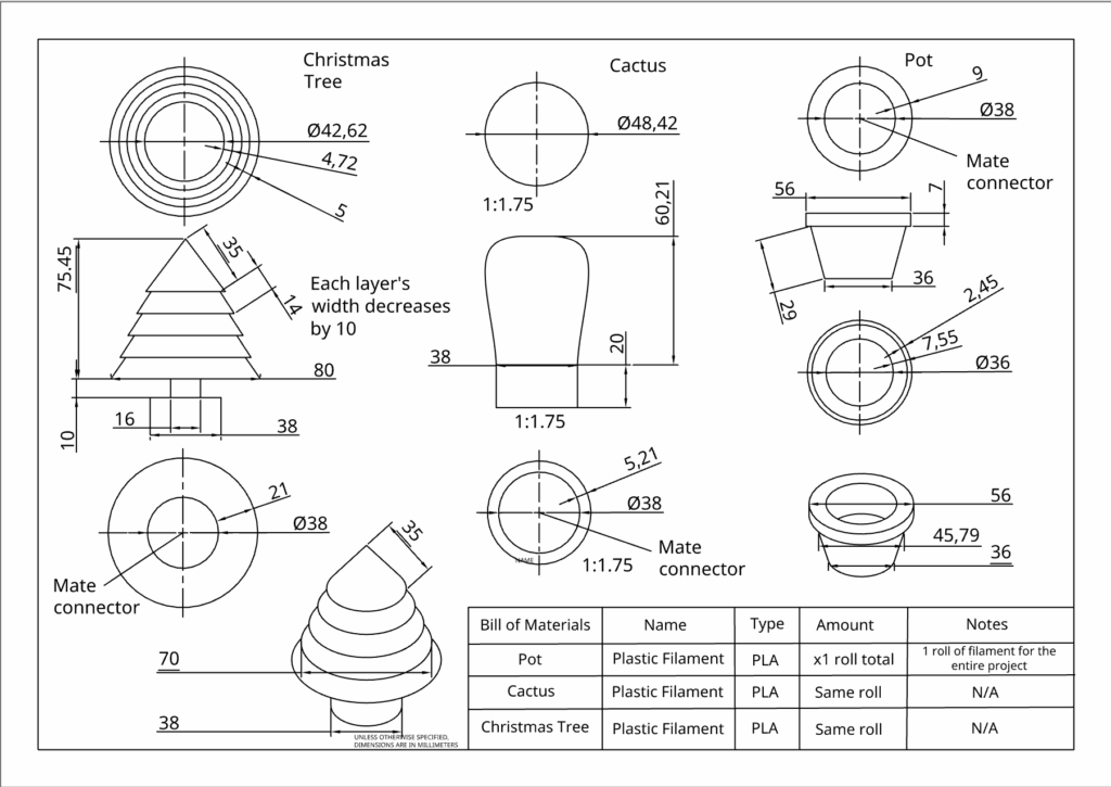 For my Fusion CAD assignment, I designed a pot that could hold various types of houseplants. To showcase my idea, I created a cactus and a small Christmas tree to accommodate the pot. I created this design in OnShape as a model and blueprint for a 3D printed project.
