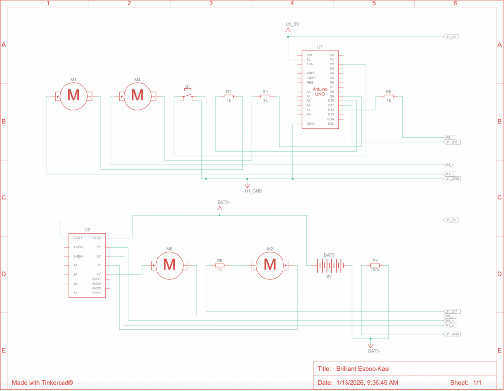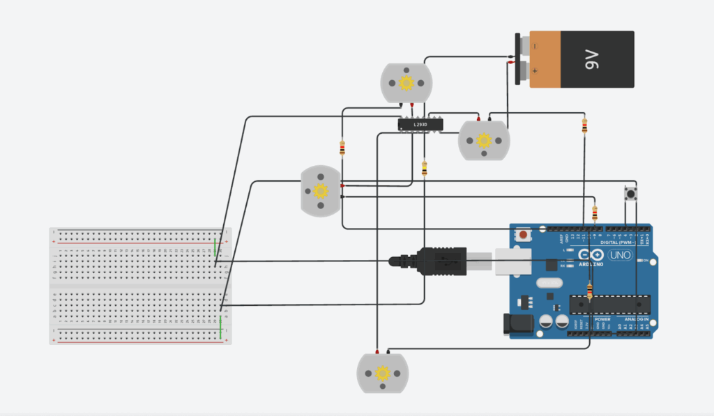 The designs below showcase the initial design of our vehicle’s Arduino system. A motor driver acts as the motherboard of the system. This motor drive is connected, through the breadboard, to the power pin on the Arduino board. Four motors are attached to the motor driver to power the 8 wheels that make up our original treads. Lastly, a button is wired into the system such that when pressed, the four motors run simultaneously, as this allows for easy control in the testing environment.