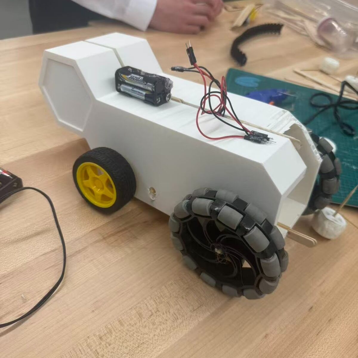 The primary issue we encountered with the initial design of the vehicle body was that it was too large and complex for efficient testing. The roof of the vehicle covered the mechanical components, making it difficult to adjust our Arduino, while the head of the design served no purpose in the prototype itself. Based on these issues, we redesigned our vehicle body to be lighter and simpler, boasting only a rectangular frame with an exposed roof for easy access to adjusting our Arduino. The simpler design also allowed us to reprint the body if necessary.