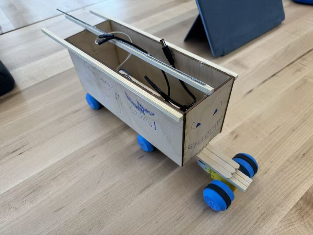 Our final design replaces the first prototype’s bulky vehicle body with a simpler model. We decided to remove the vehicle’s head, as it did not serve a purpose in our tests. The roof is exposed to allow easy editing with the Arduino and motors, and the laser-cut material provides for a lighter weight. A counterweight is also attached to the top of the vehicle to prevent toppling under the lighter load.