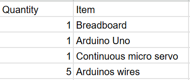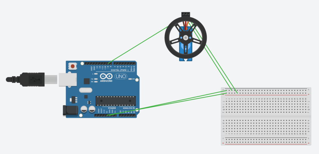 In here the signal pin on the continuous micro servo is gonnected to Digital pin 9 on the uno, and ground is connected to ground, power is connected to 5V on the breadboard.