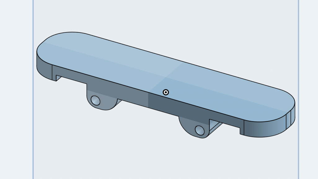 I started my design by creating a sketch. This allowed me to draw a simple rectangle in the middle of the screen, which would end up becoming the base of the skateboard. I then used the Extrude tool to turn the base of the skateboard into a 3d object. Now I had a 3d rectangle with no curves which was my objective. Using the Fillet tool, I added edges on the base of the skateboard to give it a more accurate representation. I then added another rectangle on the bottom to create the area that the wheels would be attached. I then had to use the Extrude tool again to remove the bottom part of the base to then be able to create the part that holds the wheels. I created another sketch of another rectangle to build the actual wheel base. Using the Extrude tool once again, I created the rectangle in the middle of the skateboard. I then created another sketch of 2 circles in the bottom of the base to create the spot where the axel will go. Using the Extrude tool again, I created a hollow part in the middle of the base for the axels. The base of the skateboard was nearly complete. I still had a weird chunk on the bottom so I hade to create one more sketch and then Extrude to get rid of that part. To create an aerodynamic looking skateboard, I had to use the Fillet tool on the bottom of the base to shave off some of the unimportant material at the bottom that makes the skateboard look artificial.