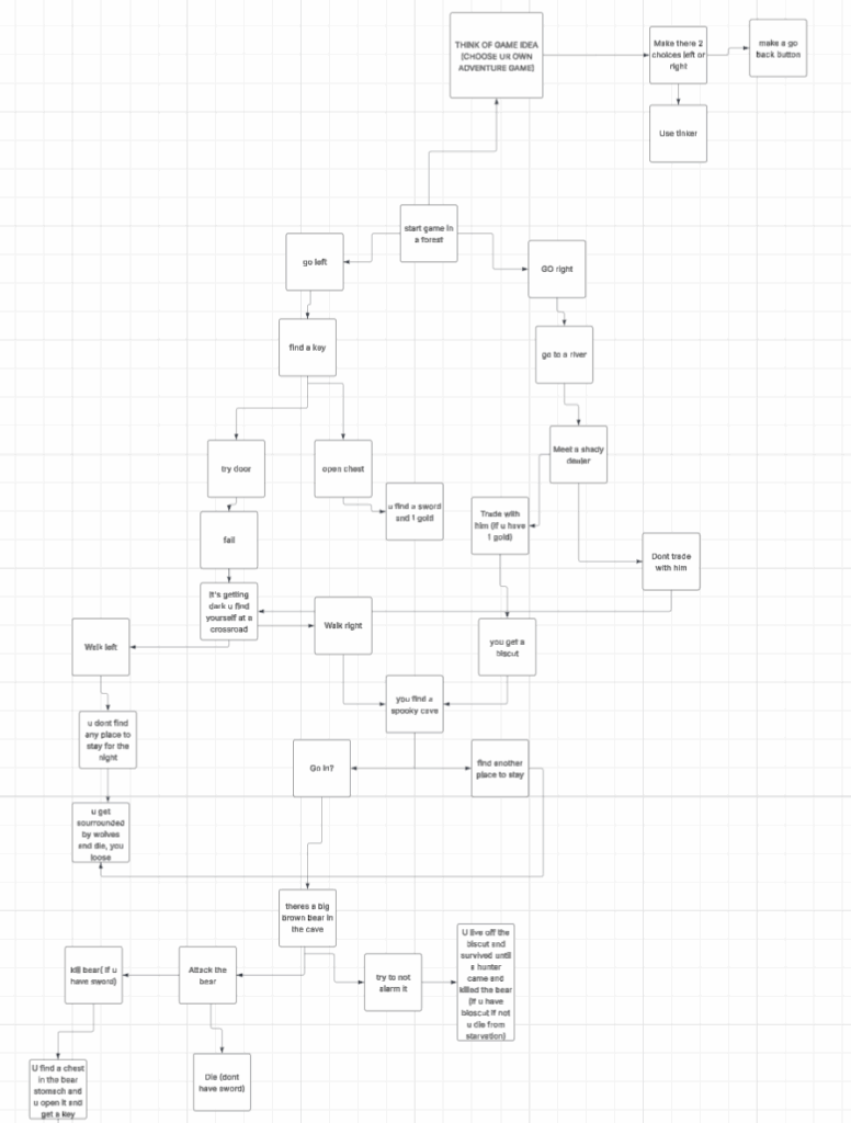 This is my flowchart and my process of ideas on how I wanted to make my game and how the user would “win” the game