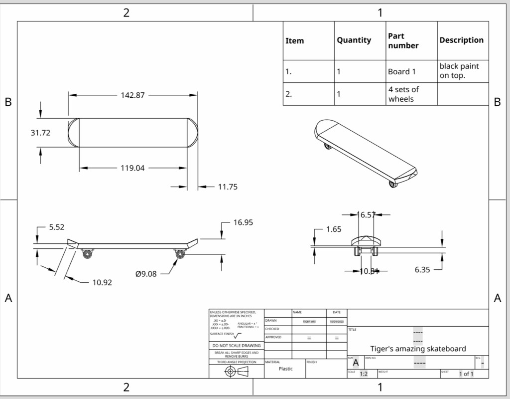 Hello, for this CAD assignment, I designed a skateboard to demonstrate my understanding of several CAD skills including, sketching, extruding, assemby, mechanical drawings, and creating a BOM. Here is my CAD project using Onshape: