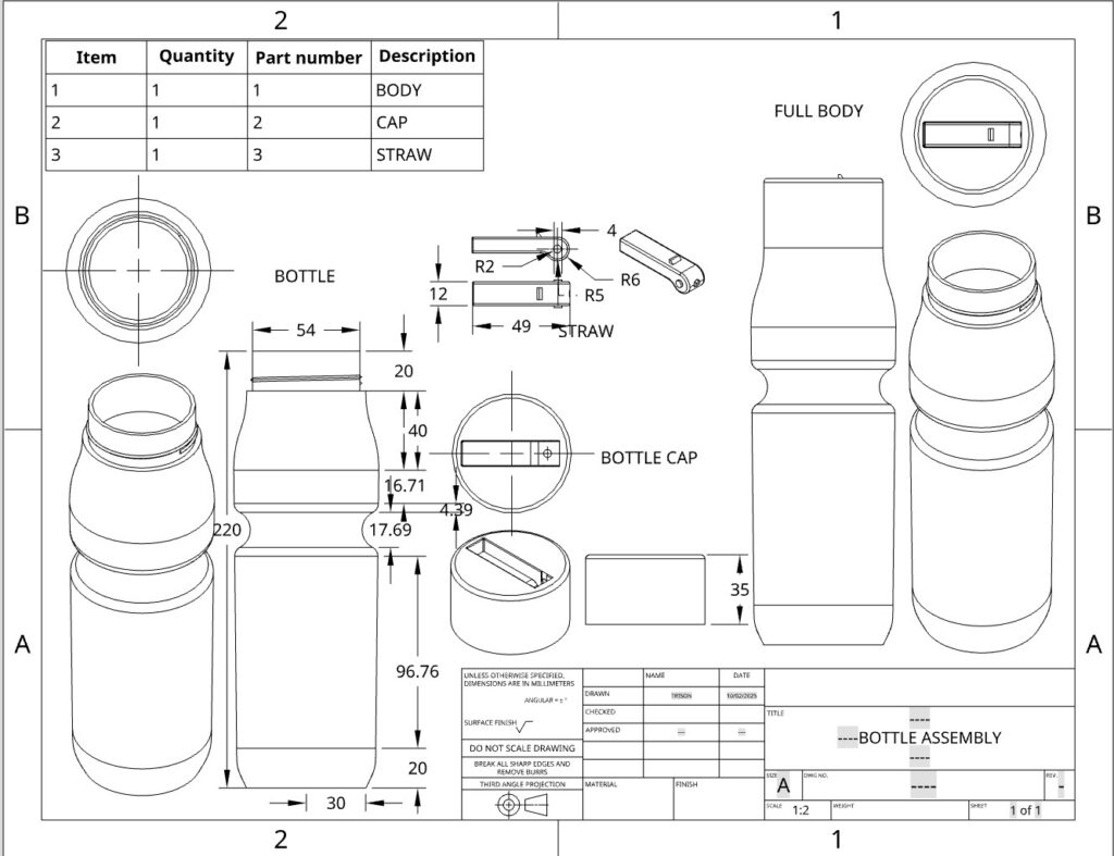 This drawing includes a BOM, dimensions, scale, a front, top and isometric view for each part as well as the whole assembly. With this drawing all requirements are achieved.