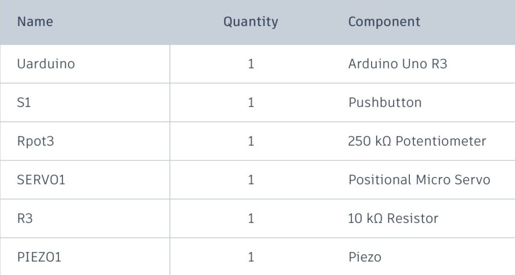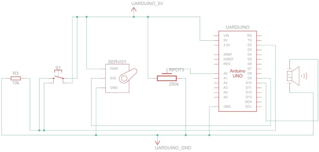 Here is a circuit schematic of the project. I briefly went through the parts of the circuit earlier but for ease of view the whole schematic is here. Before I click the button to start the timer, I adjust the potentiometer that will set the duration of the timer, and after that I will push the button. While the timer is ticking the servo will adjust its rotation to display the time. Once the time is over the piezo buzzer will sound for a brief moment and we can start another timer. Looking in hindsight this schematic is a little bit different from the prototype but I can’t really predict that so this will have to do.