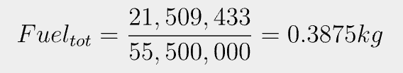 Lastly to find the fuel needed we must take the energy, divide by our vehicles efficiency, and lastly divided energy required by the density of the type of fuel (the amount of energy J/kg stored in the fuel source).
