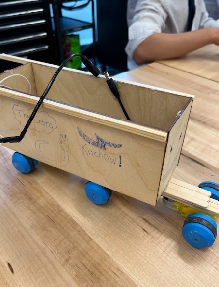 Although my group made impressive progress in our planning stages and had set our eyes on an ambitious design we soon realised we could have overcomplicated our design. Unfortunately our first vehicle prototype did not function on our first test day due to four main problems which had to do with our code, enclosed design, weak axels, and our original print mistake. Our code did run smoothly in our online simulation however when it came to building our prototype we found out the motor driver was unable to divide power evenly and simply just overloaded causing the circuit to be completely immobile. Following this failure we tried to pivot last minute and were unable to fix this problem for this prototype. However, we gained inspiration on how we could make the arduino code the minimal viable product (MVP) that still solved our problem. Our enclosed design made it very difficult to put together the circuit inside of the vehicle causing us to waste time trying to configure our design. As we managed to put together our design we soon realised that the wooden axels were beyond weak and proved to be unable to hold the wheels weight causing them to just snap and fall off. Our last problem had to do with a small problem we faced orignially being a misdesign in our vehicle body. Originally we were meant to have the motors come out of the bottom of the vehicle but our file wasn’t saved properly and this big hole dissipeared. We then spent a long time trying to drillpress holes in the side of the vehicle only for the wheels to barely touch the ground deeming our vehicle non functionable. These many problems and the crushing feeling of failing on test day motivated my group and I to knock our next iteration out of the park.